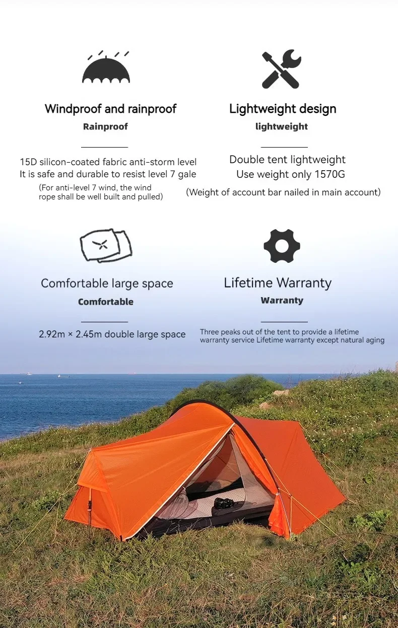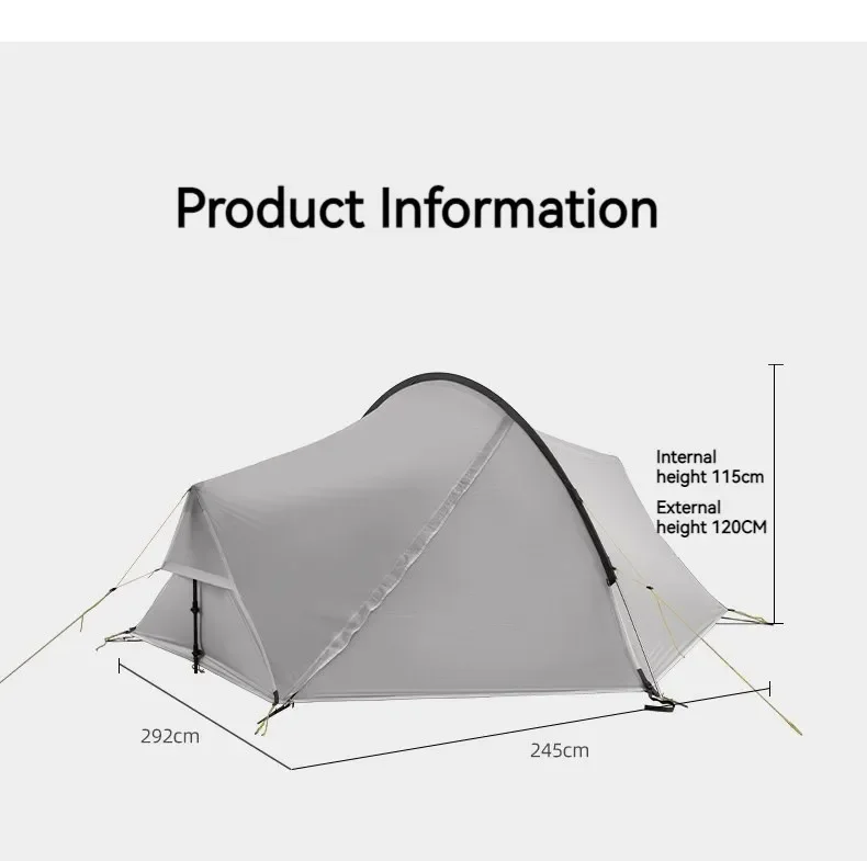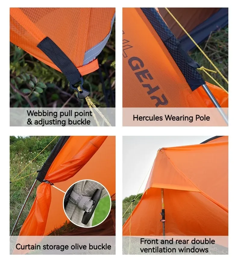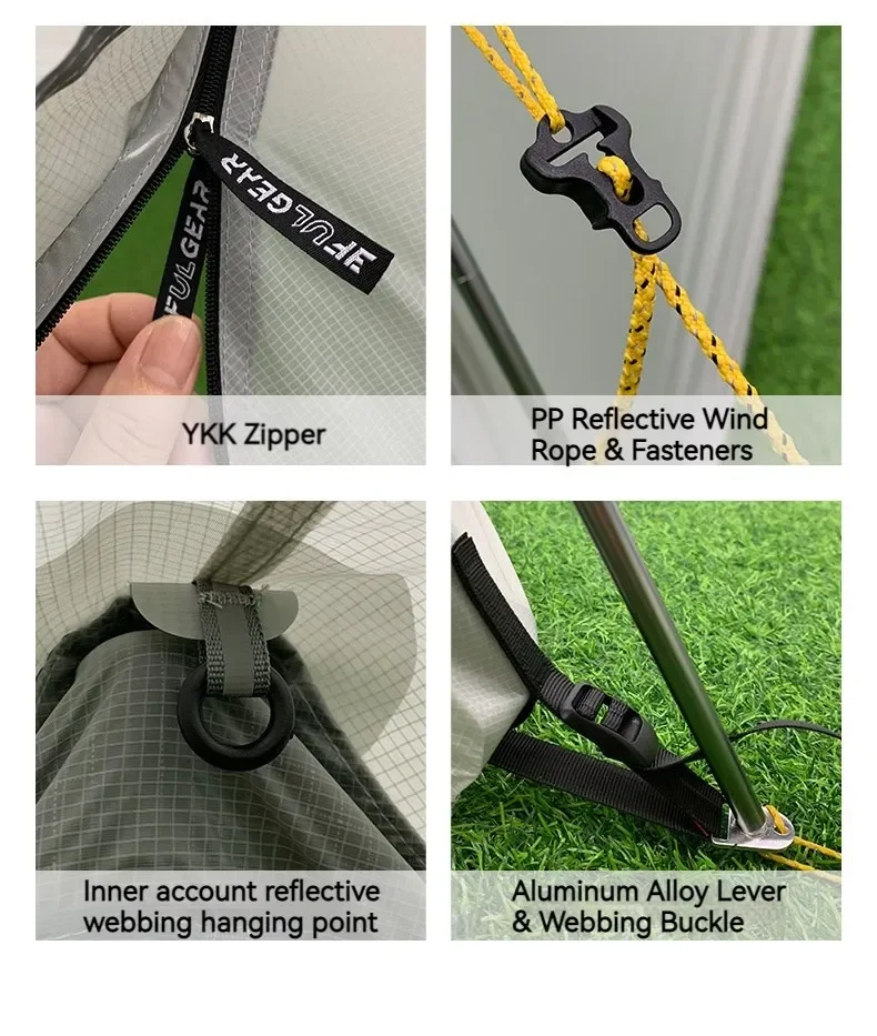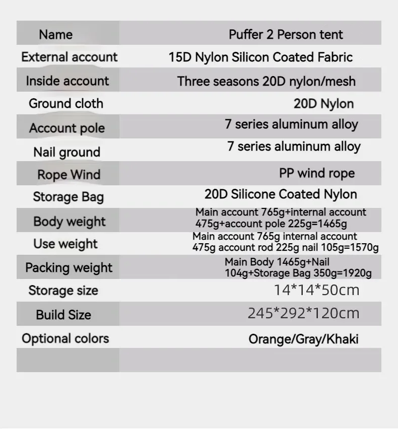 Packing List: outer tent, inner tent, pole, 10 nails, flooprint, repair supplies, 4 storage bags
